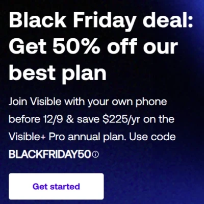 Use code BLACKFRIDAY50 and get Visible's flagship unlimited annual plan for $225 for your first year or an average cost of just $18.75/month! Taxes and fees are included.